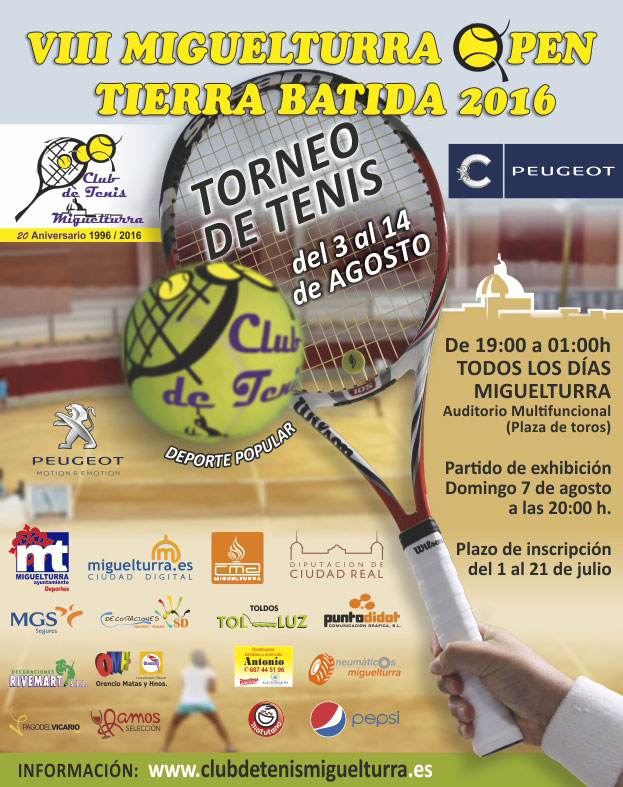 Del 3 al 14 de agosto se desarrollará la Octava Edición del "Open de Tenis de Tierra Batida Ciudauto de Miguelturra", organizada por el Club de Tenis de Miguelturra en colaboración con la Concejalía de Deportes del Consistorio y otras casas comerciales y que se desarrollará en el Auditorio Multifuncional, en las dos pistas que se van a habilitar para el desarrollo del mismo.