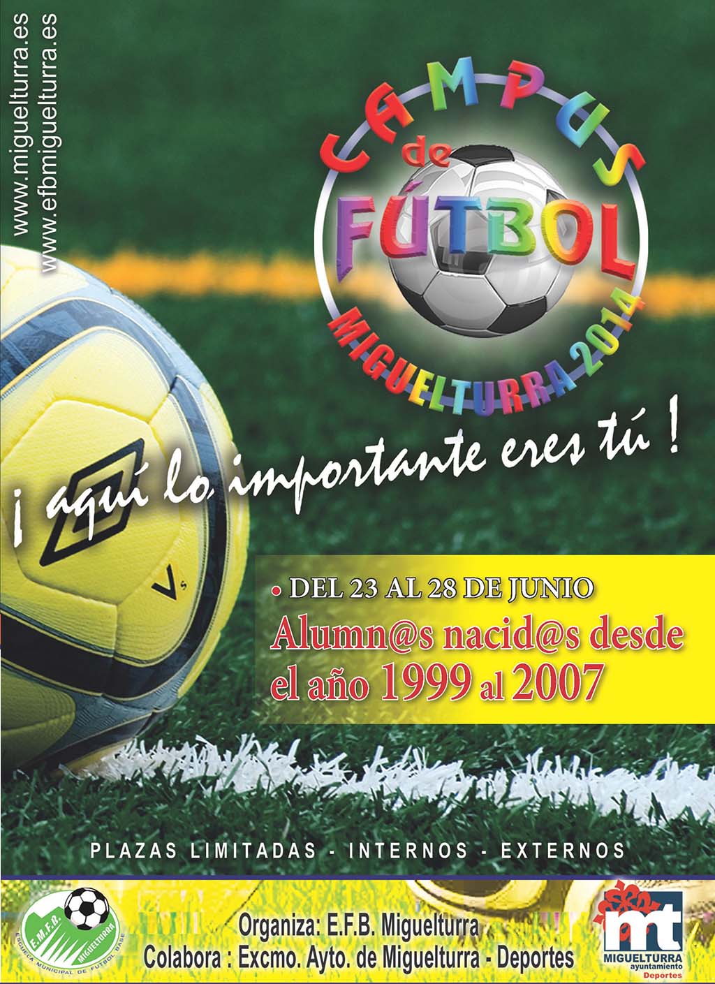 El Campus de Fútbol de Miguelturra 2014 se desarrollará del 23 al 28 de junio para jóvenes nacidos y nacidas desde el año 1999 al 2007, y que no sólo admite plazas externas sino también internas, plazas limitadas.