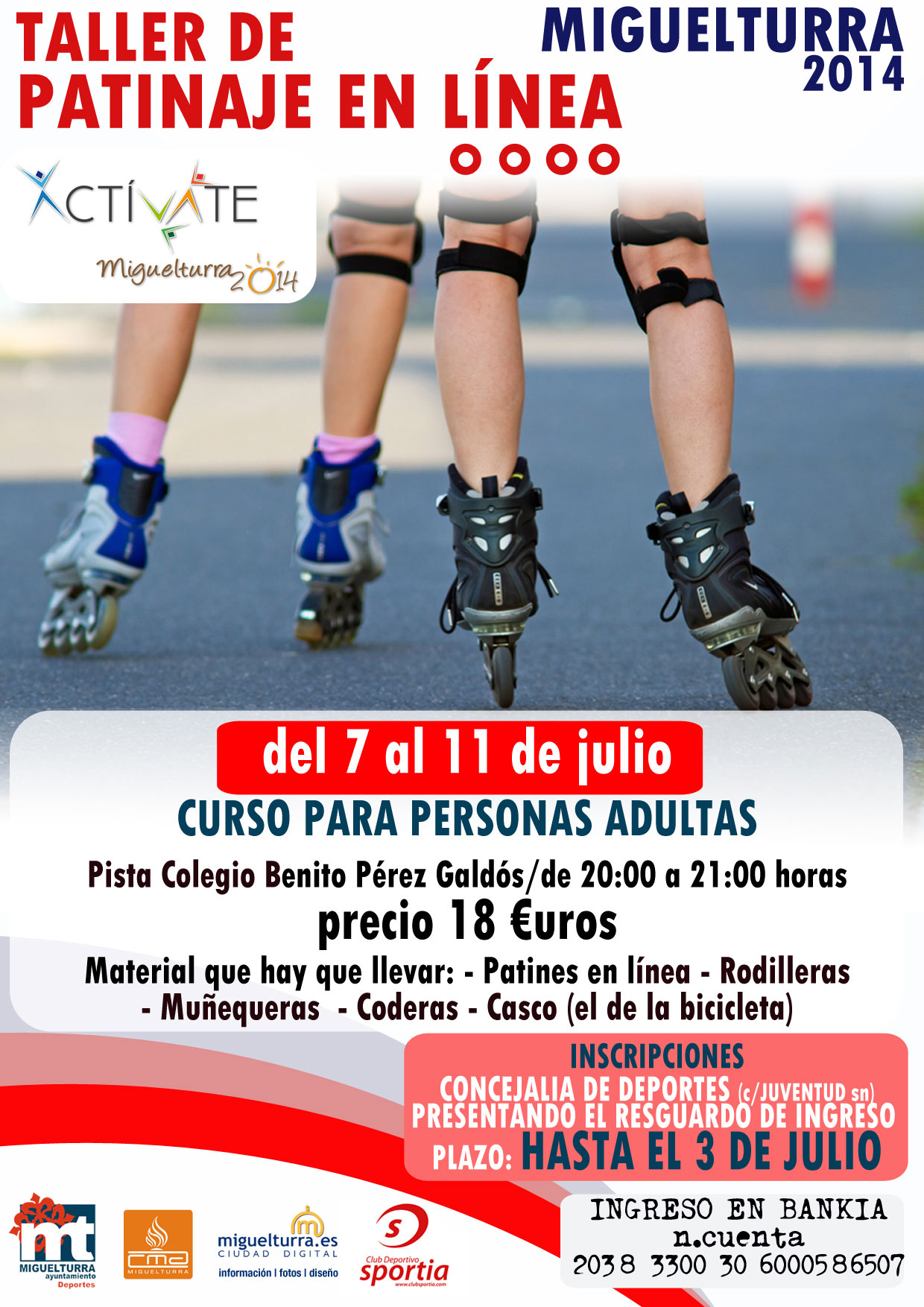 Este taller de patinaje en línea para personas adultas tiene un coste de matrícula de 18 euros por persona, al que habrá que ir, además de los propios patines, con elementos de protección tales como rodilleras, casco, muñequeras, coderas y casco; el taller de aprendizaje de patinaje en línea es otro de los eventos del programa "Actívate 2014. No dejes que te lo cuenten" puesto en marcha por el consistorio miguelturreño para este verano de 2014 y que continúa con el taller de jóvenes que se impartirá días antes, de esta forma cualquier persona ya sea niño-a o adulto-a puede participar en ellos.