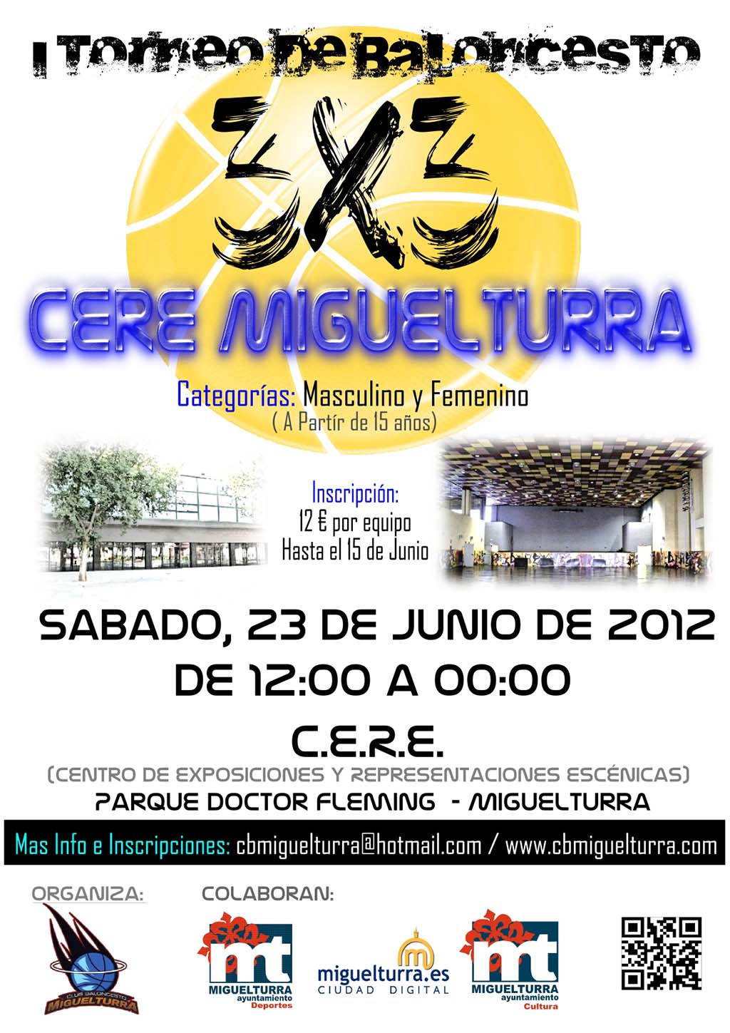 El sábado 23 de Junio desde las 12 de la mañana y hasta las 12 de la noche tendrá lugar en Miguelturra, la Primera edición del "3x3 Cere Miguelturra", un campeonato de baloncesto en la calle, que como novedad se va a celebrar en el Centro de Representaciones Escénicas de la localidad. Esta idea surgió hace unos meses en el seno del CB Miguelturra, con el objetivo de sacar el baloncesto a la calle, para que todo el mundo conozca este deporte, y además hacerlo en uno de los lugares más emblemáticos de la localidad. Las inscripciones ya están abiertas, pudiendo participar en categoría masculina y femenina, siempre y cuando tengan más de 15 años de edad.