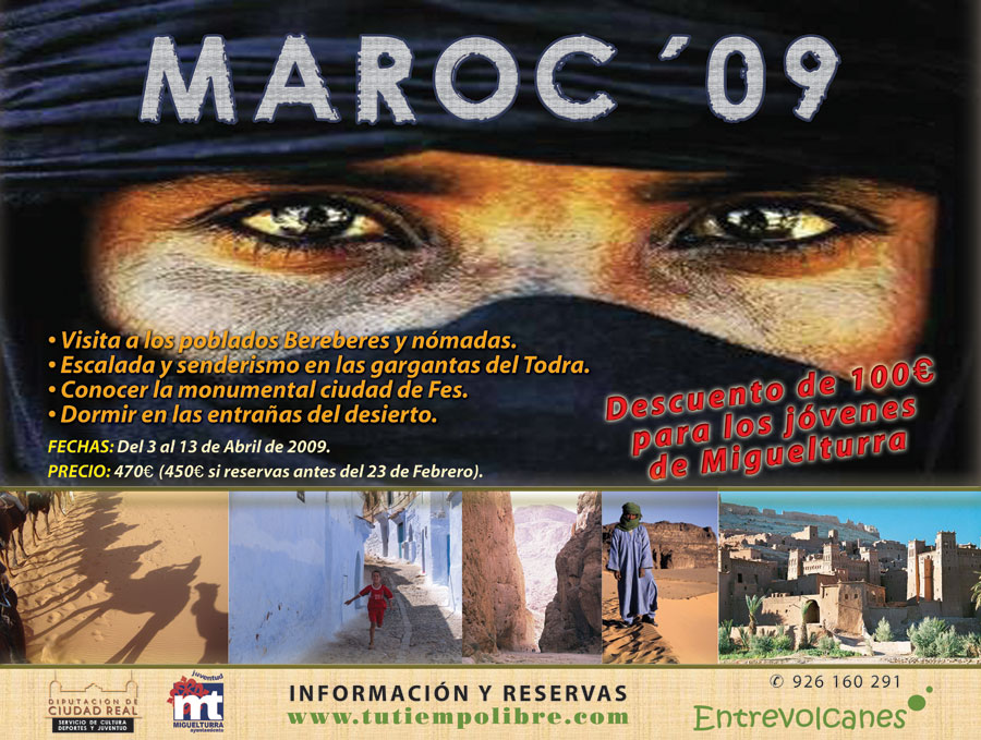 La empresa "Entrevolcanes" en colaboración con Diputación Provincial y el Área de Juventud del Ayuntamiento de Miguelturra dan a conocer el programa del viaje a Marruecos que tradicionalmente por fechas de Semana Santa se suele realizar desde hace ya varios años y que tiene cada año una mayor aceptación tanto entre los jóvenes de Miguelturra como de otras localidades aledañas.