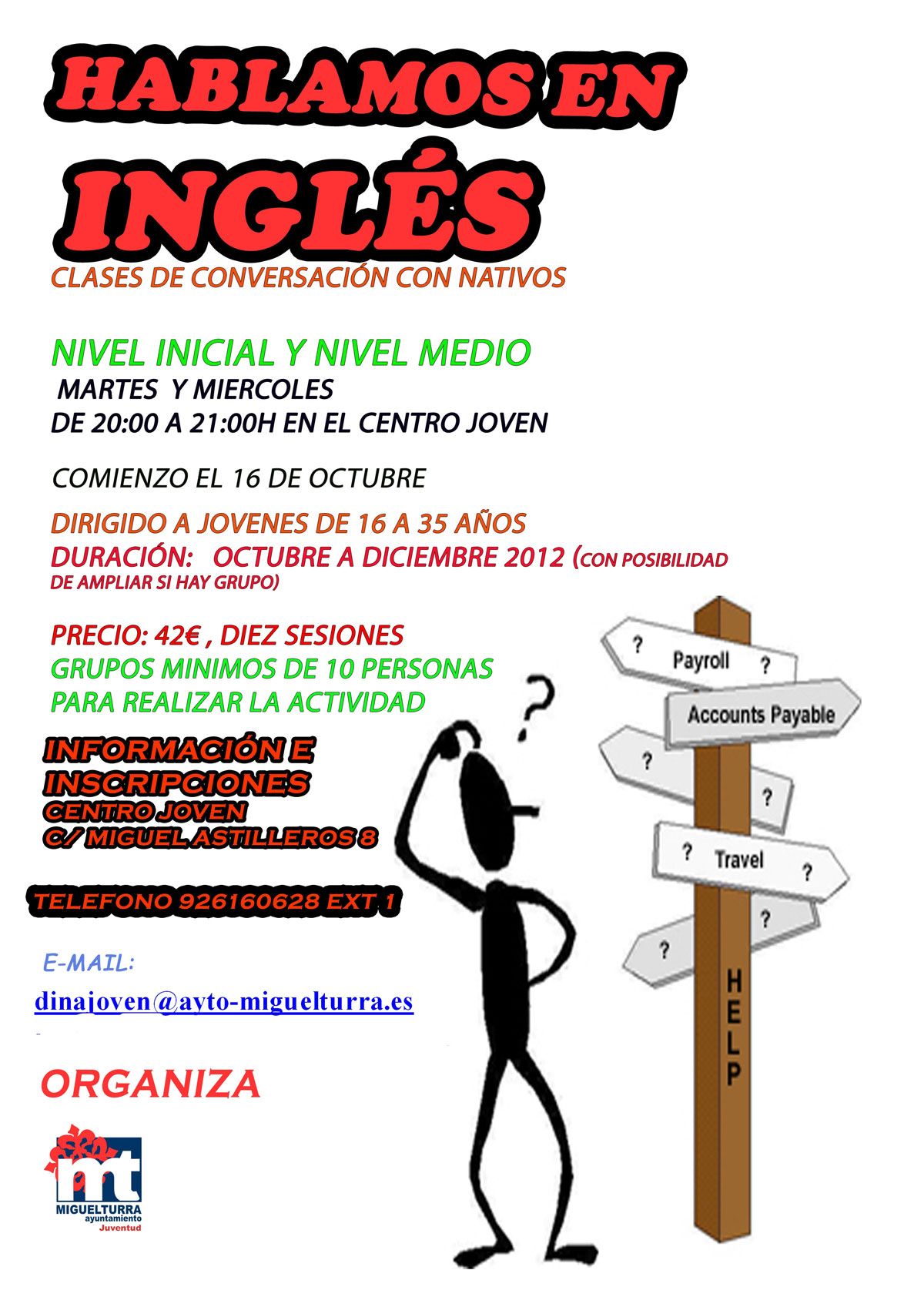 Este curso, que se inicia el 16 de octubre, está dirigido a jóvenes de entre 16 y 35 años que tengan un nivel inicial o medio de conversación en inglés y se impartirá los martes y miércoles de 20:00 a 21:00 horas en el Centro Joven de la localidad, de octubre a diciembre, con posibilidad de ampliación si hay grupo.