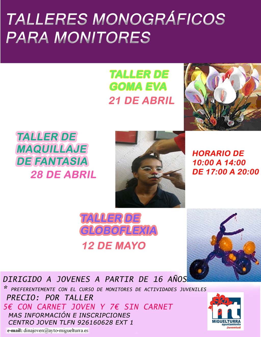 Más información como siempre en el Centro Joven de Miguelturra en la calle Miguel Astilleros, nº 8 o a través del e-mail: dinajoven@ayto-miguelturra.es o informajoven@ayto-miguelturra.es. El teléfono de contacto es 926 160628 ext. 5514, 5501 o 1. El horario de atención al público es: por las mañanas, de 9:00 a 14:30 horas y, por las tardes, de 17:00 a 19:00.