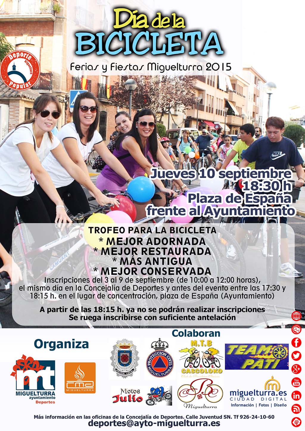La Concejalía de Deportes del Ayuntamiento de Miguelturra organiza, como ya es tradicional dentro del programa de deportes de Ferias y Fiestas, el "Día de la bicicleta", cuyo día de celebración será el jueves, 10 de septiembre. Se trata de otra de las actividades programadas dentro de la sección de Deporte Popular.