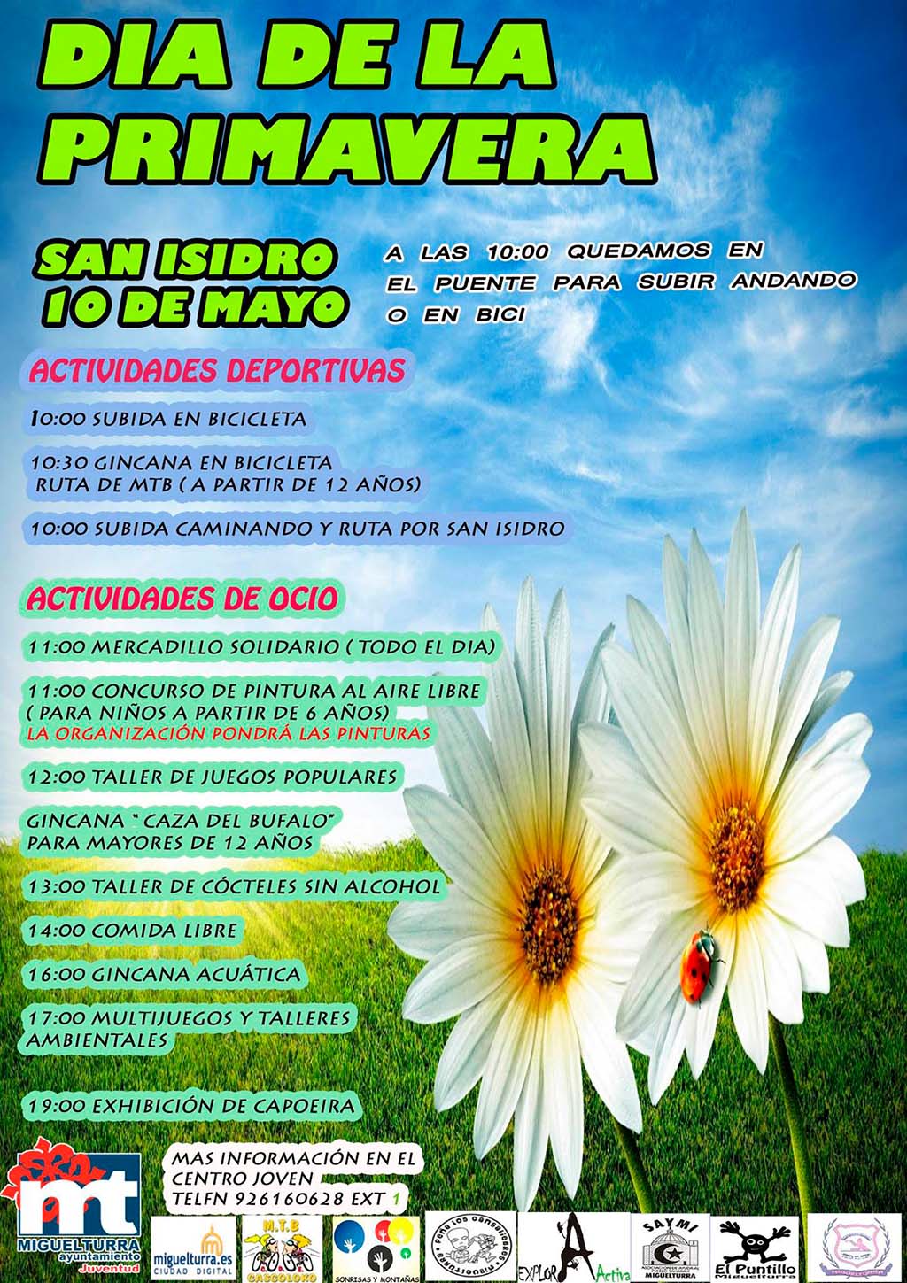 La Concejalía de Juventud del Ayuntamiento de Miguelturra ha organizado el "Día de la Primavera", el sábado 10 de mayo diversos actos deportivos y de ocio, y en el que colaboran MTB Cascoloko, Sonrisas y Montañas, Peña Los Cansaliebres, Explora Activa, Saymi, Peña El Puntillo y CDE Tenis de Mesa de Miguelturra.