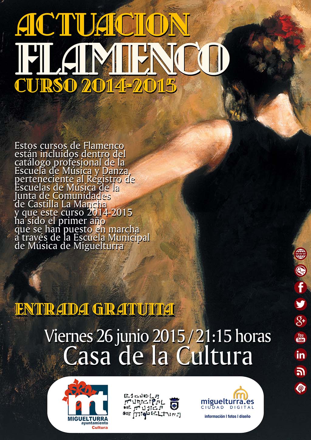 La Escuela de Música y Danza de Miguelturra, dependiente del Área de Cultura del consistorio, en colaboración con portal web desarrollará este viernes 26 de junio una actuación de flamenco a cargo del alumnado que ha participado en el curso 2014-2015.