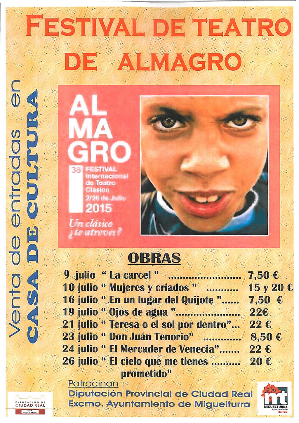 El Área de Cultura del Ayuntamiento de Miguelturra informa que tiene a la venta entradas para diversas obras que se representarán en el Festival Internacional de Teatro Clásico de Almagro, gracias a la subvención que aporta Diputación Provincial de Ciudad Real.