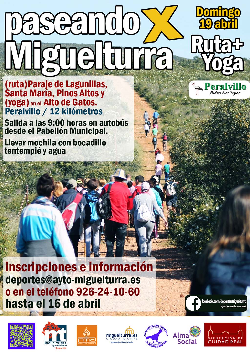 La Concejalía de Deportes del Ayuntamiento de Miguelturra organiza para el próximo domingo 19 de abril una nueva actividad del programa "Paseando por Miguelturra", en colaboración con el portal web www.miguelturra.es, Asociación Cultural y Senderista Correcaminos de Miguelturra, Alma Social y Diputación Provincial de Ciudad Real.