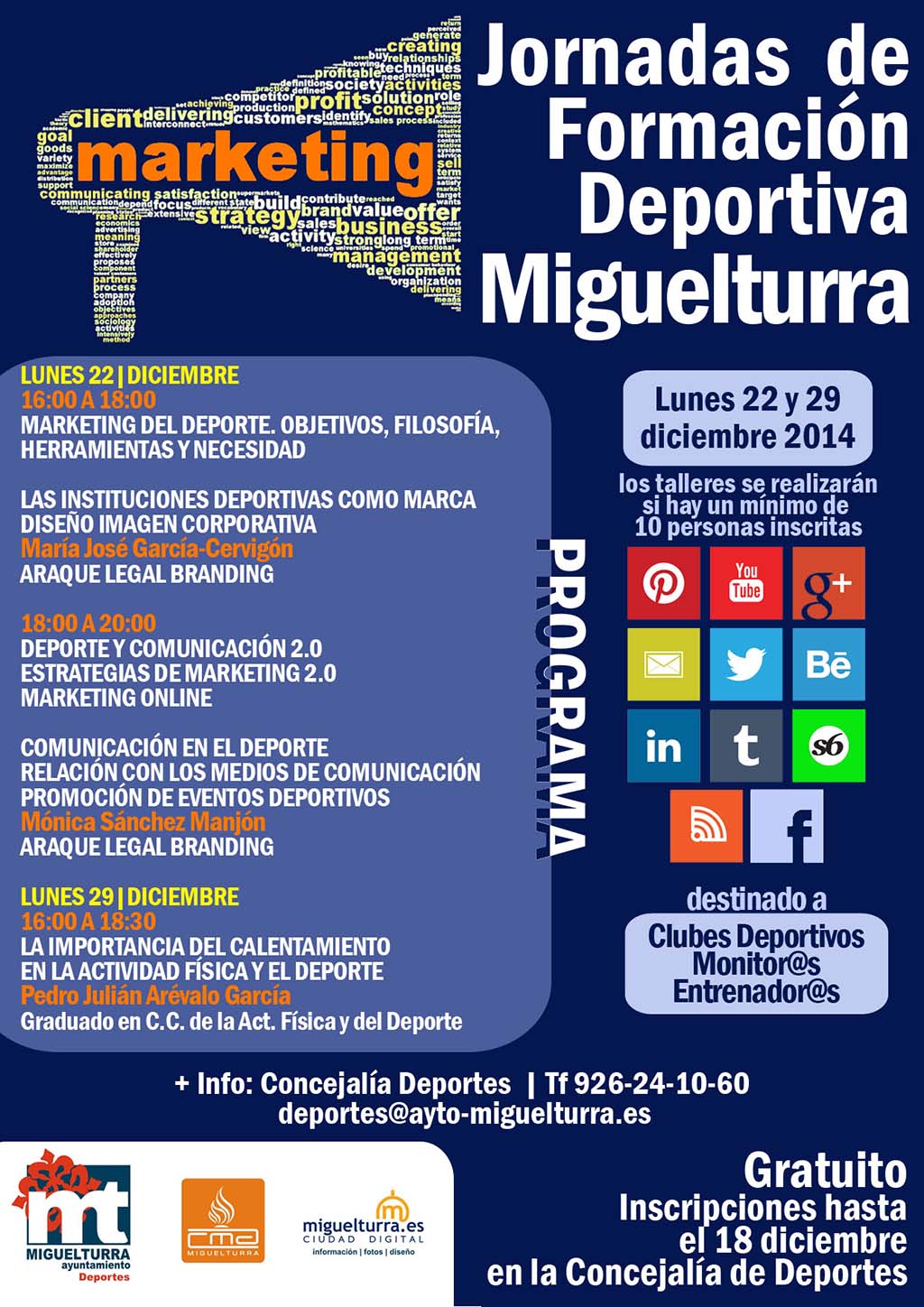 La concejalía de Deportes del Ayuntamiento de Miguelturra en su afán de dotar a los gestores de los clubes de la localidad así como a monitores-as de las Escuelas Deportivas y entrenadores-as de las diferentes disciplinas deportivas de la mejor formación y siendo conscientes que ésta es el pilar básico de la mejora continua y del desarrollo y crecimiento profesional y por ende de nuestros deportistas, ha organizado, en colaboración con www.miguelturra.es, unas jornadas formativas que se llevarán a cabo el próximo día 22 y 29 de diciembre.