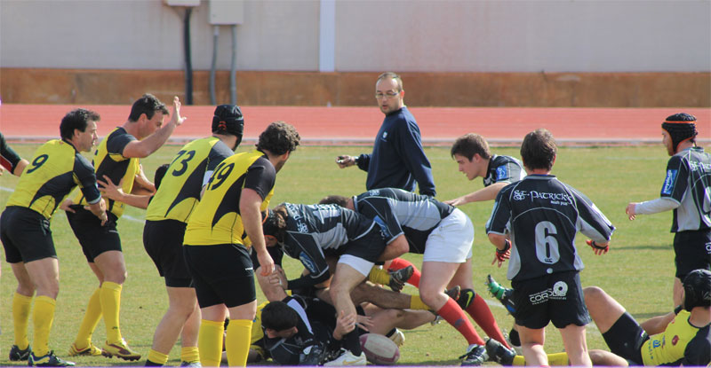 Sería el frio de la mañana de domingo pero los arlequines salieron fríos al campo. En frente estaba el supuestamente tercer mejor equipo del grupo, pero rápidamente se vio que aquello no iba a ser un paseo militar. Con un viento que complicaba el juego a la mano y el pie, fueron los granadinos los que leyeron bien estas condiciones y se dedicaron a avanzar con el paquete de delantera. Los arlequines, demasiado metidos en los rucks, concedían golpe tras golpe que permitía a los visitantes avanzar gratis. Además, esta involucración de delanteros conllevaba una insuficiente presión a la línea granadina concediendo libertad a su apertura para hacer y deshacer a su antojo. A un golpe transformado de los de Granada, respondía Nicolás del Río con otro. A un ensayo bajo palos transformado por los visitantes, respondió el equipo local, a través de su capitán Enrique Sanz, con otro más escorado pero igualmente transformado por Nicolas. A pesar del mal juego, nos íbamos al descanso con un empate en el marcador.