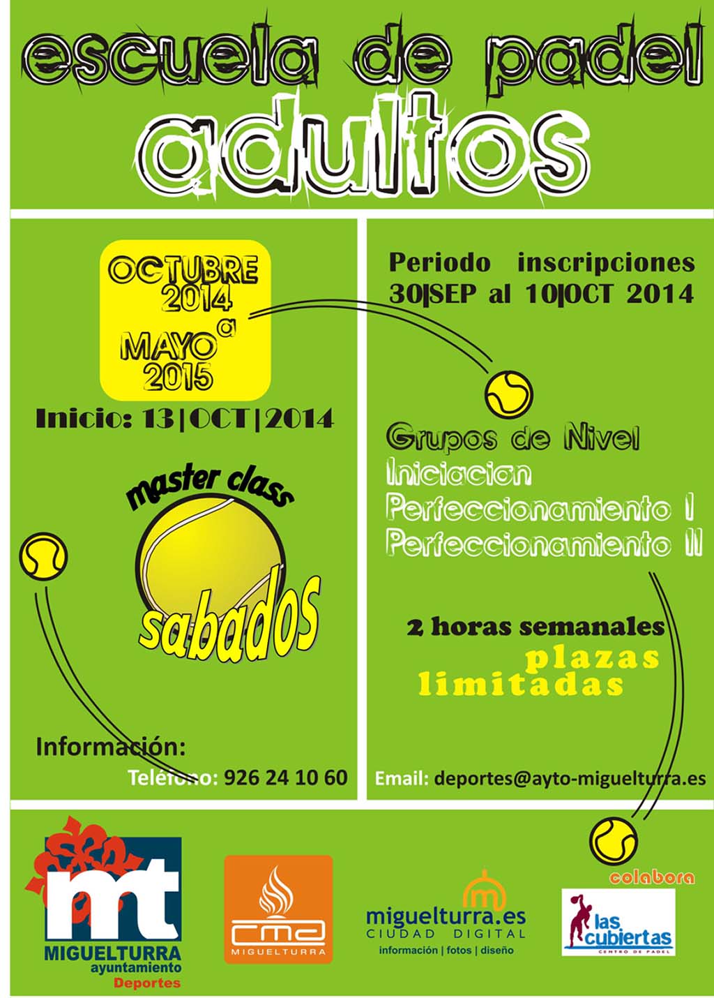 Desde este martes 30 de septiembre y hasta el 10 de octubre inclusive está abierto el plazo para poder inscribirse en la Escuela de Pádel para personas adultas del Área de Deportes del Ayuntamiento de Miguelturra, en colaboración con Centro de Pádel "Las Cubiertas".