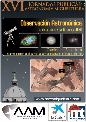 Este sábado 18 de octubre a partir de las 20 horas se desarrollará una nueva observación nocturna a cargo de la Asociación Astronómica de Miguelturra, y en la que colaboran Ayuntamiento de Miguelturra y La Caixa.