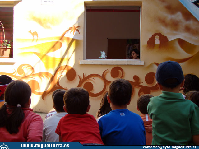 A los chavales les ha gustado los grafitis que figuran en las paredes de este patio interior y que están evocando al Sáhara y sus pobladores, desiertos y dromedarios, dunas y arenas, y donde se han dispuesto alfombras en el suelo, pufs marroquíes, y donde han podido ver el desarrollo de esta actividad de cuentacuentos.