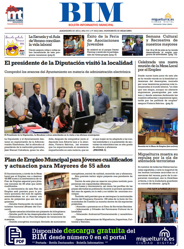 El Boletín Informativo Municipal de Miguelturra de agosto de 2016, más conocido como BIM, número 283, da a conocer en su portada como noticias más destacadas la visita de la Diputación Provincial de Ciudad Real al ayuntamiento de Miguelturra y las bases del Plan de Empleo Municipal para jóvenes cualificados-as y actuación para personas mayores de 55 años.