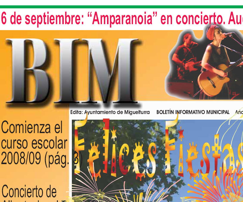 La portada de este mes hace referencia, a las ferias y fiestas de Miguelturra, que se inician este próximo fin de semana, en concreto el viernes día 7, fecha en la que también actuará en el Auditorio Multifuncional "Albertucho", a partir de las 11 de la noche. La portada recoge también y con foto principal, la segunda fase del nuevo Parque del Quijote, así como el inicio del curso escolar 2008-2009 en Miguelturra que será el próximo miércoles día 10 de septiembre en lo que respecta a los alumnos de enseñanza infantil y primaria.