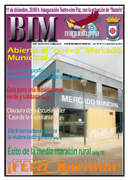 La portada de este mes hace referencia a la inauguración de la remodelación del Mercado Municipal. La portada recoge también noticias tales como la helisuperficie para emergencias sanitarias que se será una realidad en Miguelturra, guía para una Navidad más verde y solidaria, clausura de la Escuela Taller Casa de la Capellanía, actos realizados con movido del día Internacional contra la violencia de género, o, éxito de la media maratón rural, noticias que ustedes han ido leyendo y consultando en www.miguelturra.es durante estas fechas y que se recopilan con otro tipo de informaciones en este boletín informativo municipal.