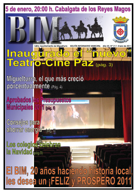 El número 217 del Boletín Informativo Municipal (BIM), que corresponde a este mes de enero de 2011, ya está siendo distribuido a la población proporcionando así a todos los vecinos de Miguelturra toda la información de actualidad que genera el municipio. Como suele ser costumbre, y haciendo uso de las nuevas tecnologías, pueden consultarlo directamente desde este mismo lunes 10 de enero en este portal web municipal, a tan solo un clic.