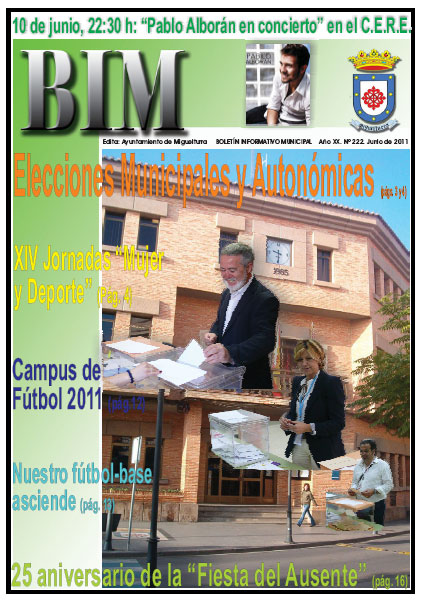 El número 222 del Boletín Informativo Municipal (BIM), que corresponde a este mes de Junio de 2011, ya se puede consultar a partir de hoy 7 de junio en la página web municipal oficial del Ayuntamiento de Miguelturra, www.miguelturra.es. Como suele ser costumbre, y haciendo uso de las nuevas tecnologías, pueden consultarlo directamente a tan solo un clic.