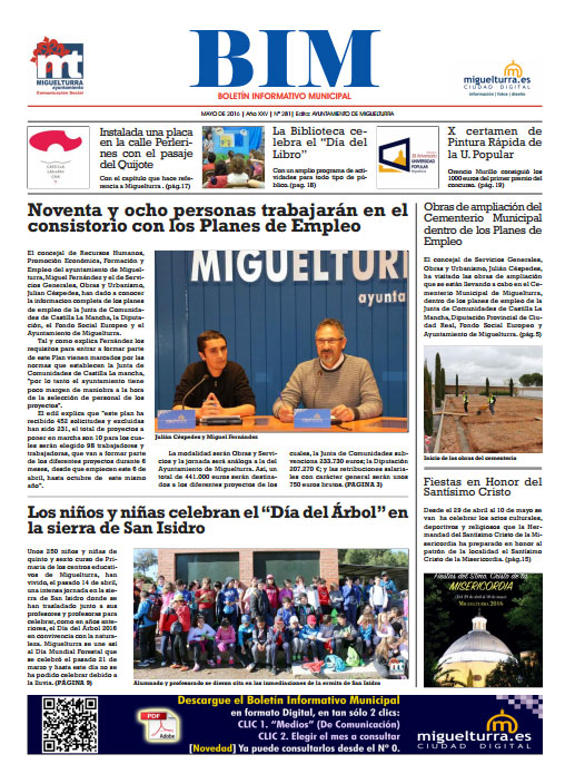 El Boletín Informativo Municipal de Miguelturra de mayo de 2016, más conocido como BIM, número 281, da a conocer en su portada como noticias más destacadas las 98 personas que trabajarán en diversas áreas dentro de los Planes de Empleo municipales, por un lado, y las actividades educativas del Día del Árbol realizadas en San Isidro.