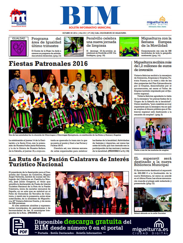 El Boletín Informativo Municipal de Miguelturra de octubre de 2016, más conocido como BIM, número 285, da a conocer en su portada como noticia más destacada las Ferias y Fiestas de septiembre.