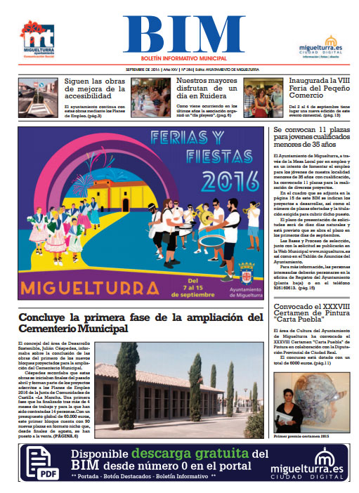 El Boletín Informativo Municipal de Miguelturra de septiembre de 2016, más conocido como BIM, número 284, da a conocer en su portada como noticias más destacadas las Ferias y Fiestas de septiembre.