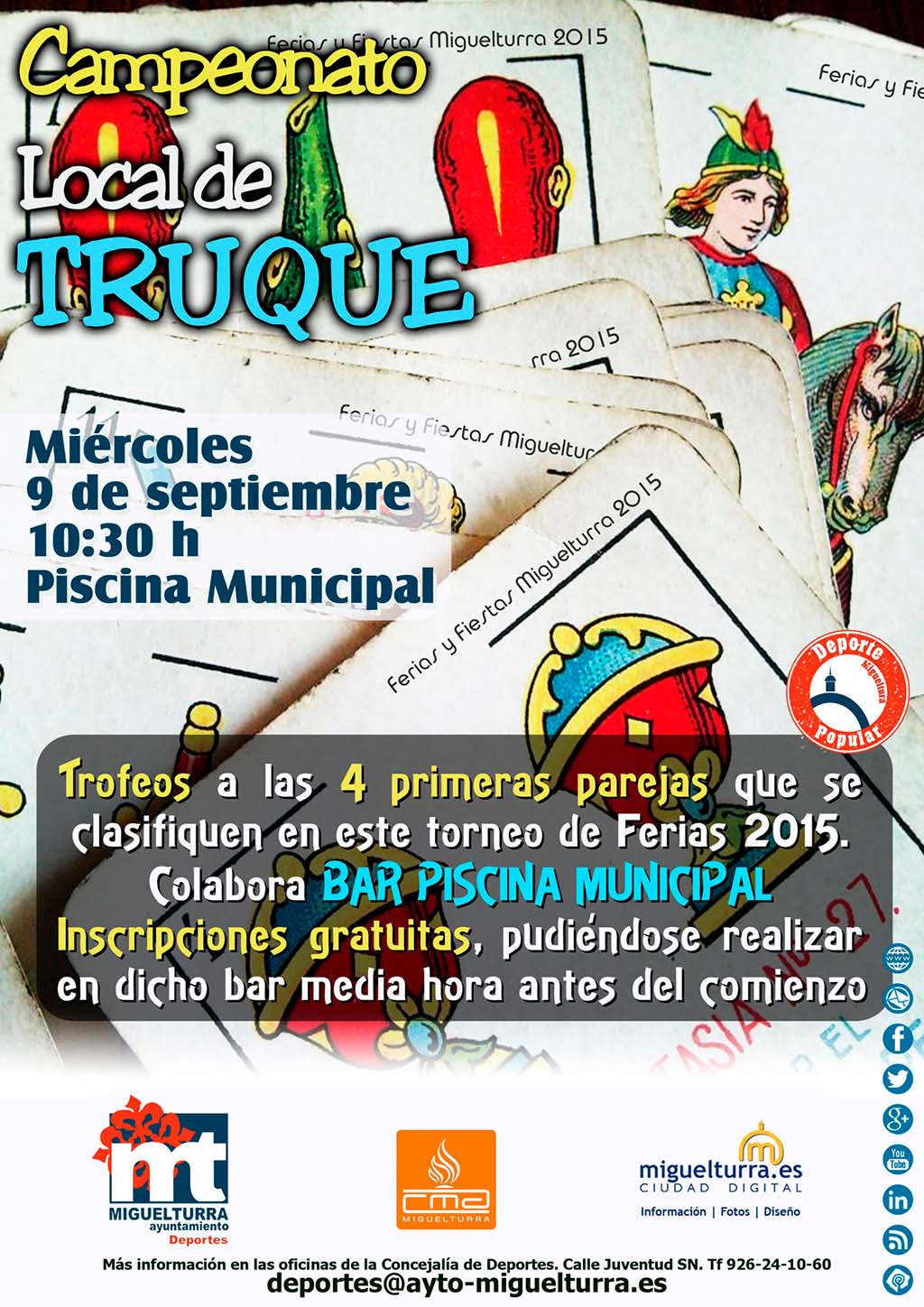 Dentro de las actividades de las Ferias y Fiestas de Miguelturra 2015 les damos a conocer el Campeonato de Truque, organizado por la concejalía de Deportes del consistorio en colaboración con el Bar de la Piscina Municipal y el portal web www.miguelturra.es, que se desarrollará como suele ser habitual en las instalaciones de la Piscina Municipal, el miércoles 9 de septiembre a partir de las 10:30 horas, evento enmarcado dentro del programa "Deporte Popular".