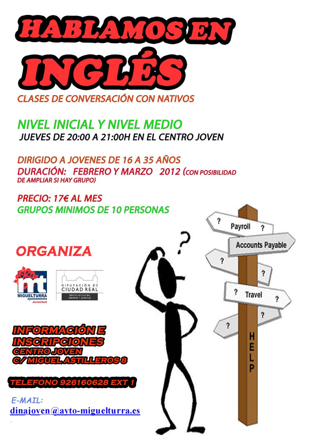 El Centro Joven, dependiente del área de Juventud del Ayuntamiento de Miguelturra ha organizado dos cursos de inglés que se iniciarán el próximo mes de Febrero. Se trata de dos novedosas iniciativas formativas: por una parte el "Curso de inglés para iniciados" y por otra "Curo de inglés nivel medio".