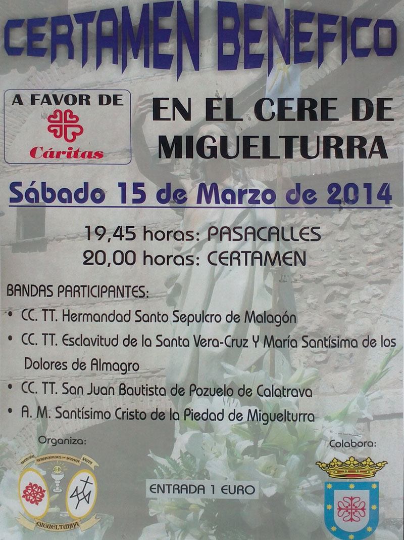 La Agrupación de Hermandades de Semana Santa en colaboración con el Ayuntamiento de Miguelturra organiza el sábado 15 de marzo un certamen benéfico musical solidario a favor de Cáritas, evento musical que se realizará en el CERE a partir de las 19:45 horas, hora en la que dará comienzo un pasacalles seguido del certamen a las 20:00 horas, con entrada a 1 euro.