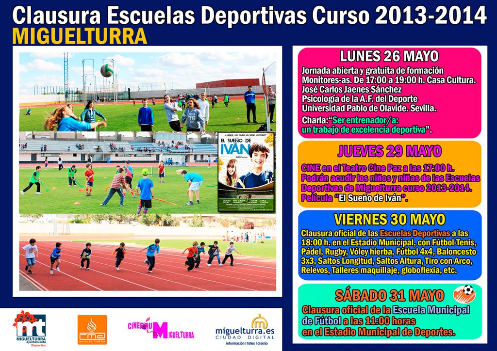 "El viernes 30 de mayo realizaremos la clausura propiamente dicha, en el Estadio Municipal de Deportes, donde haremos fútbol, tenis, pádel, rugby, vóley hierba, fútbol 4 por 4, baloncesto 3 por 3, salto de longitud, salto de altura, tiro con arco, relevos, con talleres de maquillaje, globoflexia y alguna otra actividad sorpresa. Además estará la clausura oficial de la Escuela Municipal Deportiva de Fútbol Base de Miguelturra, ese día 31 de mayo, a las 11:00 horas, en el Estadio Municipal de Deportes", ha relatado el edil de Deportes.