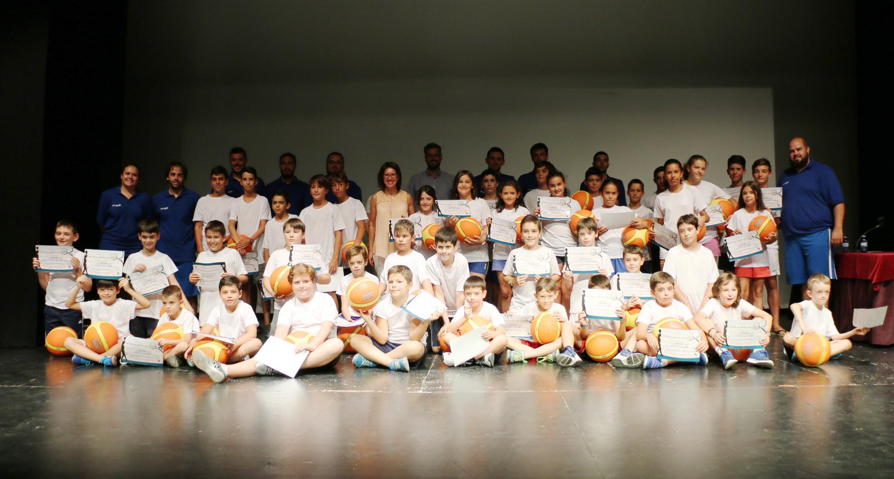 La clausura en el Cine Paz, donde cada niño acompañado por su monitor ha recibido el diploma acreditativo y un detalle (una pelota de baloncesto), se ha clausurado con una foto de familia.