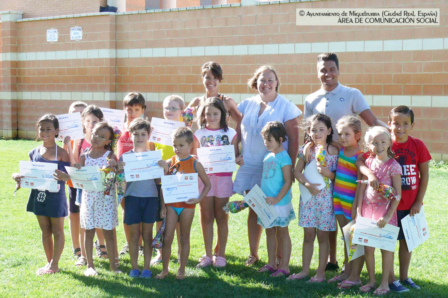 La Concejalía de Deportes del Ayuntamiento de Miguelturra ha clausurado en la mañana de este viernes los cursos de natación de verano, que se han venido desarrollando en la Piscina Municipal, a la que ha asistido la concejala de Festejos Populares y Juventud, Luz María Sánchez, junto con los padre y madres, abuelos y abuelas de los niños y niñas que han realizado estos cursos, que ha hecho entrega de diplomas y de unas chuches a los y a las participantes.