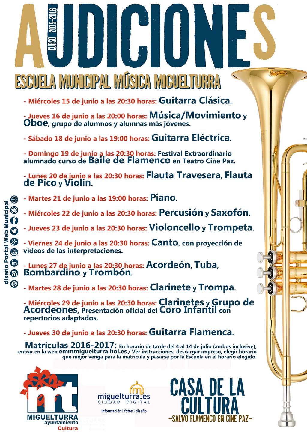 La Escuela Municipal de Música y Danza de Miguelturra, dependiente del área de Cultura, organiza como todos los años académicos, al finalizar el curso lectivo, una serie de audiciones, conciertos y festivales en pos de mostrar el trabajo realizado durante todo el año 2015-2016, a lo largo de todos los niveles musicales y materias que se imparten.