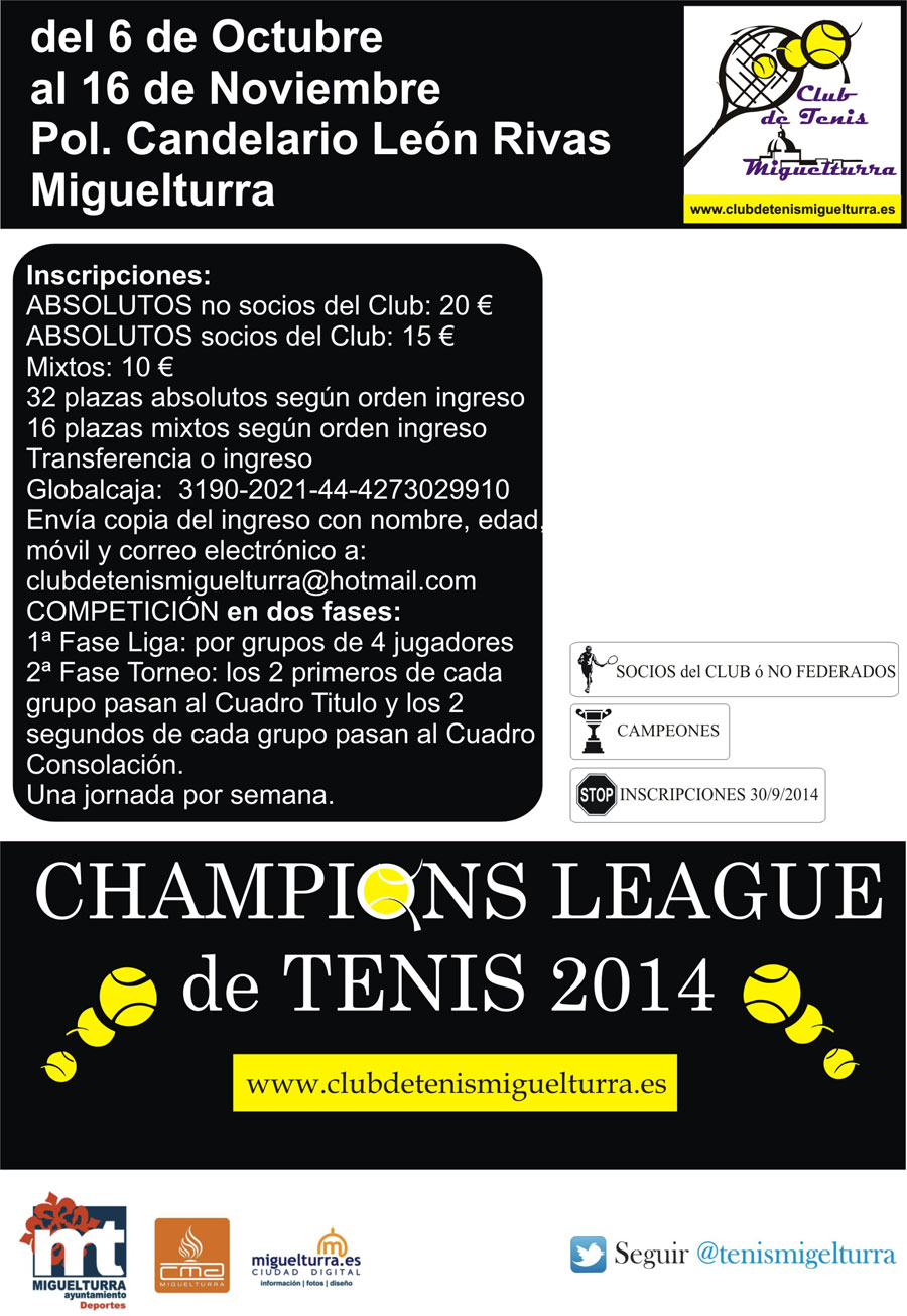 El Club de Tenis de Miguelturra informa sobre la celebración de la "Champions League de Tenis 2014" en el Complejo Deportivo Candelario León Rivas de Miguelturra, competición que se lleva a cabo gracias a la colaboración inestimable del Ayuntamiento de Miguelturra a través de su concejalía de Deportes, del 6 de octubre al 16 de noviembre inclusive, cuyas inscripciones están abiertas desde estas fechas y hasta finales de septiembre.