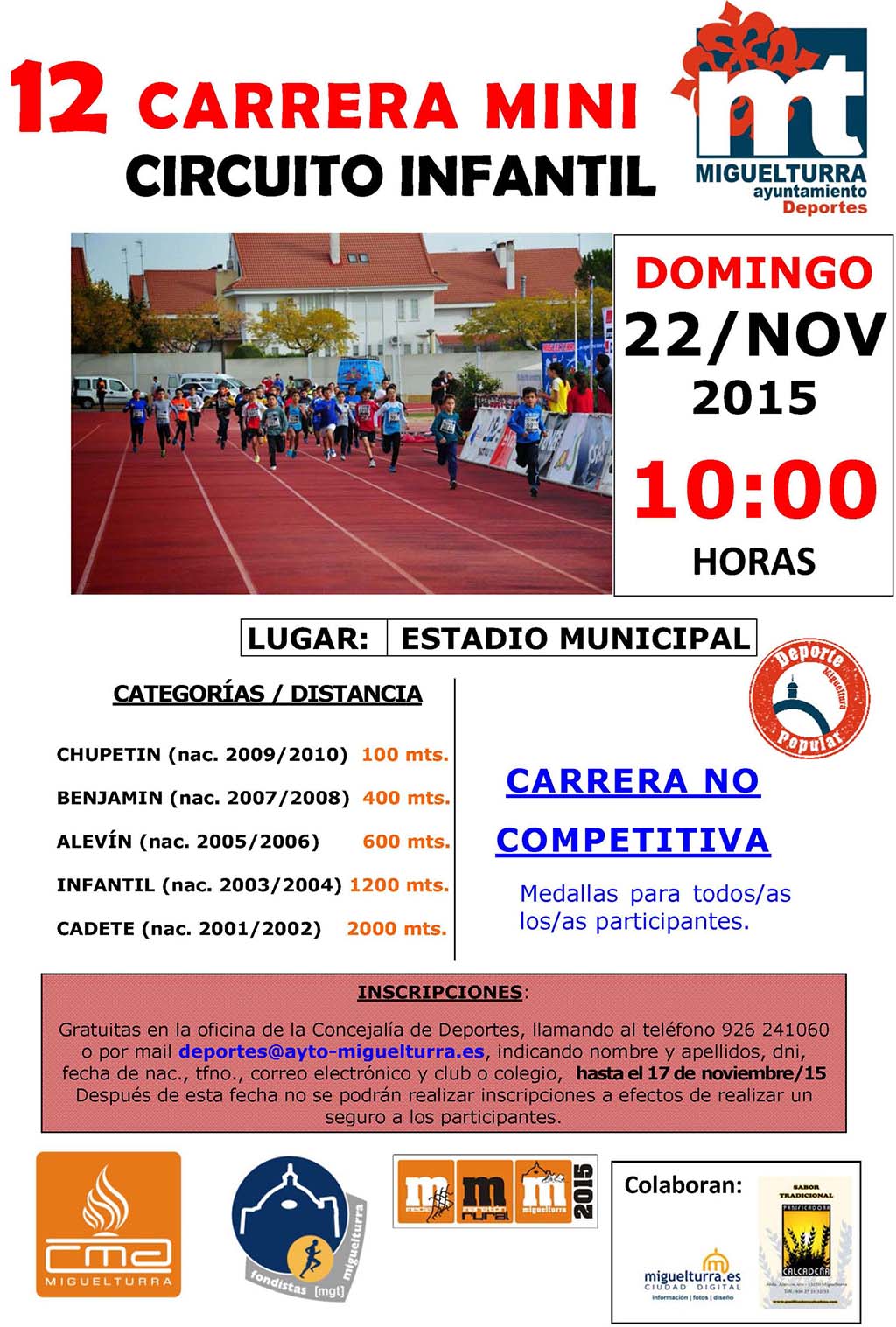 La Concejalía de Deportes del Ayuntamiento de Miguelturra informa del comienzo de inscripciones para participar en la "Carrera Mini" que se desarrolla, como ya es tradicional, el mismo día de la Media Maratón Rural Villa Miguelturra, ambas englobadas dentro del programa "Deporte Popular", carrera mini que cumple su duodécima edición y en colaboración con la asociación local Fondistas de Miguelturra y Panificadora Calcadeña.