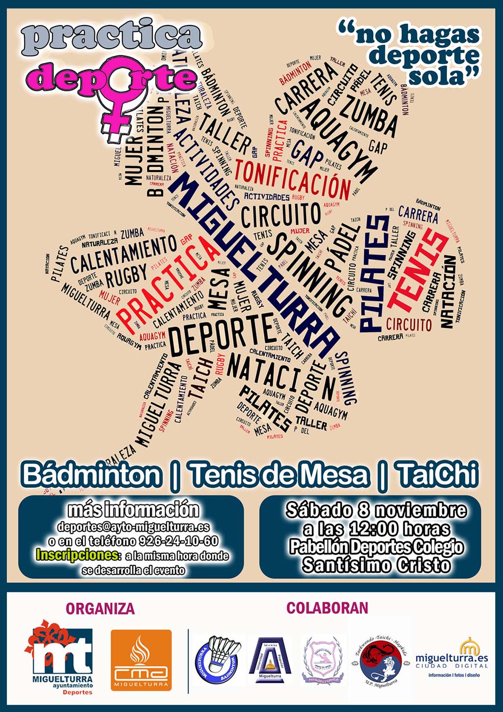 Dentro de los que organiza el Área de Deportes del Ayuntamiento de Miguelturra a favor de la actividad deportiva de las mujeres de nuestra localidad a través del programa "Practica Deporte, no hagas deporte sola", se programa un nuevo evento para el sábado 8 de noviembre.