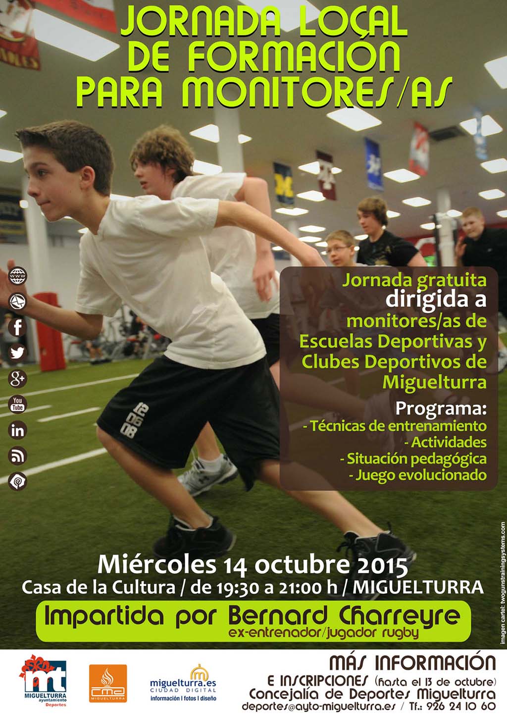 La Concejalía de Deportes del Ayuntamiento de Miguelturra desarrollará una Jornada Formativa Local, en colaboración con portal web www.miguelturra.es, prevista para el próximo miércoles 14 de octubre, que acogerá la Casa de la Cultura de Miguelturra, entre las 19:30 horas y las 21:00 horas, que versará sobre técnicas de entrenamiento, dirigida a monitores/as de las escuelas deportivas y clubes deportivos de Miguelturra.