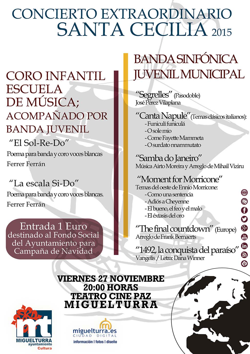 La Concejalía de Cultura del Ayuntamiento, en colaboración con portal web municipal, organiza este viernes 27 de noviembre de 2015 a partir de las 20:00 horas en Teatro Cine Paz el Concierto Extraordinario en honor a Santa Cecilia, patrona de la música, en el que participarán la Banda Sinfónica Juvenil Municipal y el Coro Infantil de la Escuela de Música de Miguelturra bajo la batuta de Ángel Ocaña, director de la Escuela.