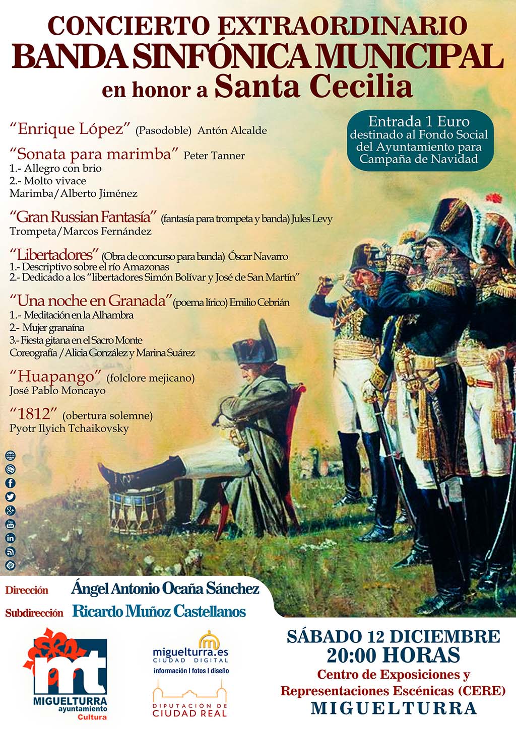 El Área de Cultura de Miguelturra, en colaboración con La Escuela Municipal de Música y portal web municipal, presenta el concierto en honor a Santa Cecilia que tendrá lugar el próximo 12 de diciembre a las 20:00 horas en el Centro de Exposiciones y representaciones escénicas (CERE).