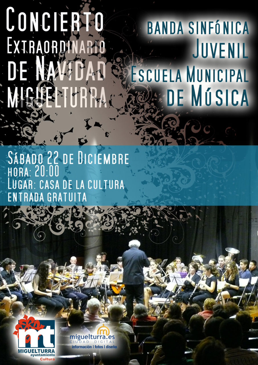 Con la colaboración del área de Cultura y del portal web municipal www.miguelturra.es, esta banda juvenil interpretará un variado repertorio que incluye valses, villancicos y obras típicas españolas, además de bandas sonoras de películas infantiles y orquestaciones de obras clásicas para banda; todo ello mezclado con la juventud de esta banda perteneciente a la Escuela Municipal de Música.