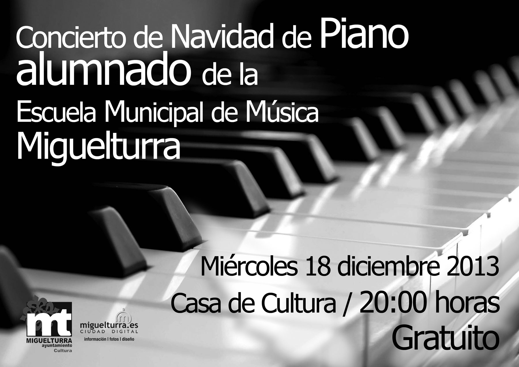 La Escuela de Música de Miguelturra, dependiente del área de Cultura del Ayuntamiento de nuestra localidad, anuncia la celebración del Concierto de Navidad de Piano a cargo del alumnado de la Escuela el próximo miércoles 18 de diciembre a partir de las 20 horas.