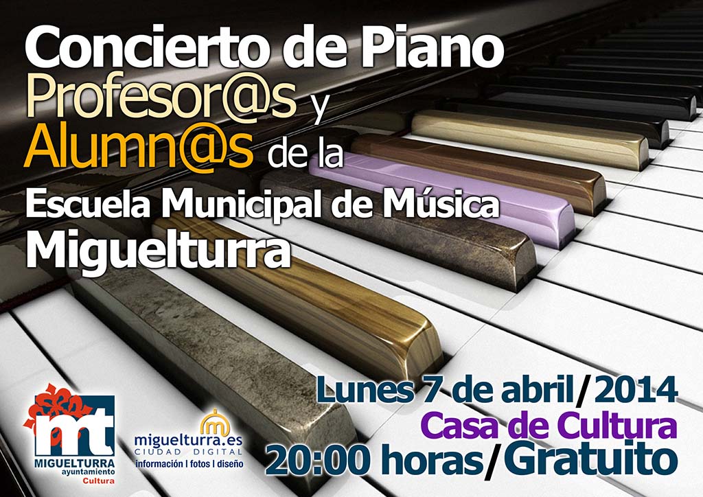 La Escuela Municipal de Música de Miguelturra, dependiente del Área de Cultura del Ayuntamiento, realizará el lunes 7 de abril a partir de las 20:00 horas un concierto en el que participarán profesores-as y alumnos-as de los diferentes cursos de piano del curso 2013-2014, en la Casa de la Cultura con entrada gratuita.
