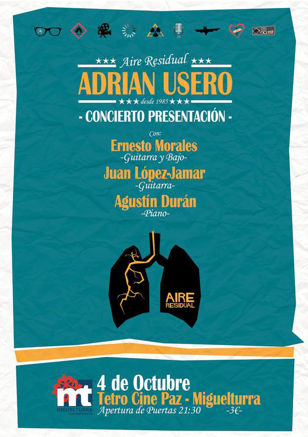 Este sábado4 de octubre, a partir de las 21:30 horas en el Teatro Cine Paz de Miguelturra, con entrada a tres euros, se presentará el nuevo trabajo musical del artista local Adrián Usero "Aire Residual", en el que colabora el Área de Cultura del Ayuntamiento de Miguelturra.