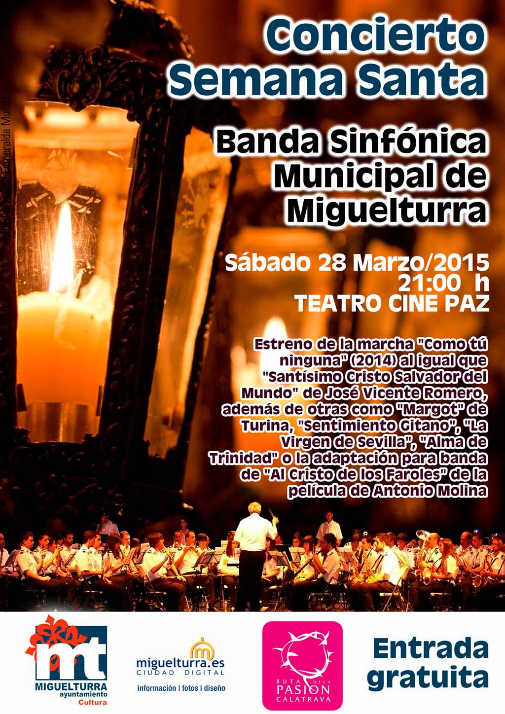 El Área de Cultura del Ayuntamiento de Miguelturra ha proyectado para el sábado 28 de marzo de 2015 el Concierto de Semana Santa a cargo de la Banda Sinfónica de Miguelturra; éste se realizará en el Teatro Cine Paz a partir de las 21 horas con entrada gratuita.