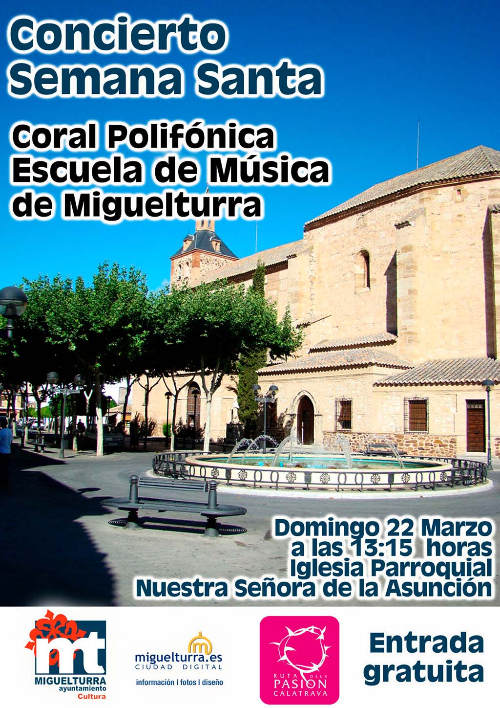 Dentro de las actividades programas por la Escuela de Música de Miguelturra, dependiente del Área de Cultura del Ayuntamiento, este domingo 22 de marzo se desarrollará el Concierto de Semana Santa de la Coral Polifónica de la Escuela de Música en la Iglesia Parroquial de Nuestra Señora de la Asunción, sita en la Plaza de la Constitución.