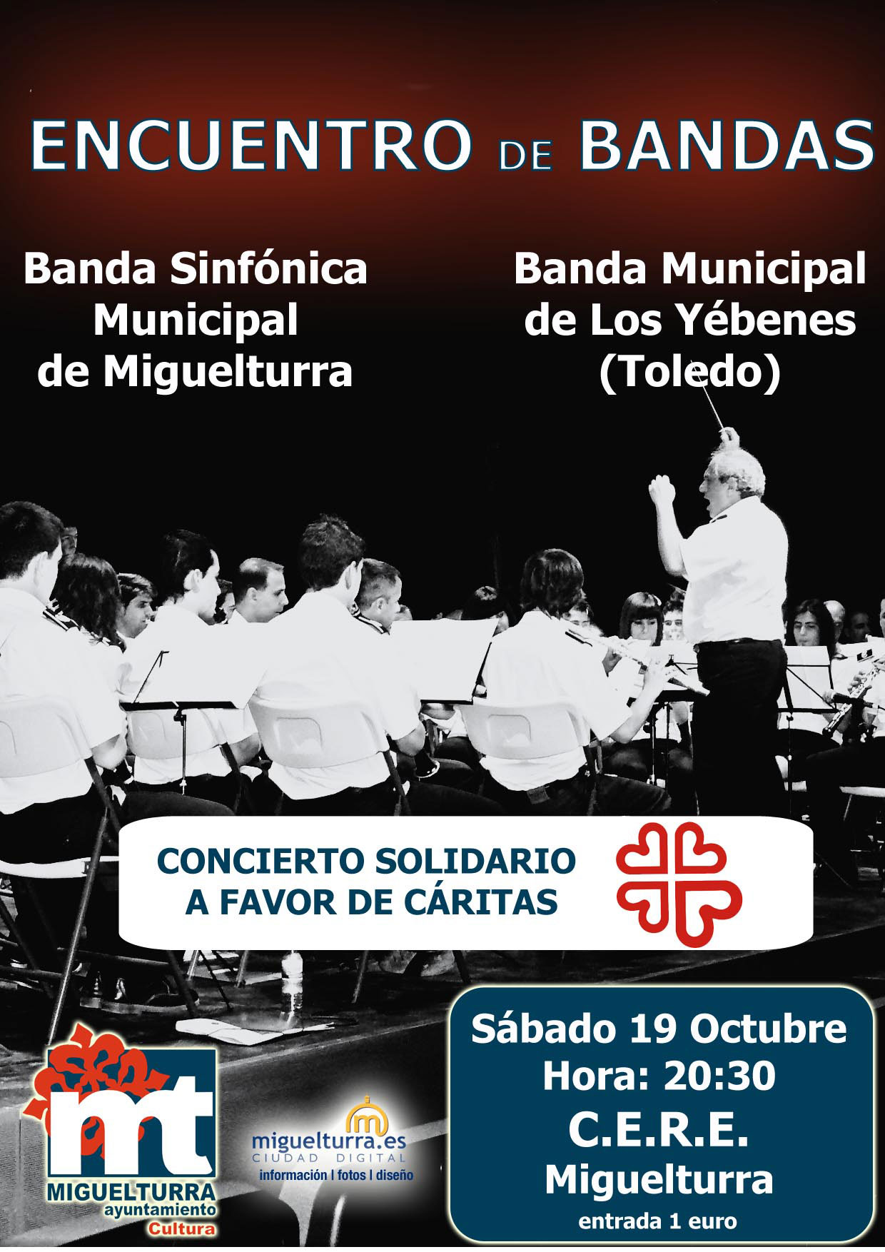 El área de Cultura del Ayuntamiento de Miguelturra organiza a través de la escuela municipal de música, para este próximo sábado, 19 de octubre, a los 20:30 horas y en el C.E.R.E. (Centro de Exposiciones y Representaciones Escénicas) tendrá lugar un encuentro de Bandas de música entre la Banda Sinfónica Municipal de Miguelturra y la Banda Municipal de los Yébenes (Toledo), en él, ambas bandas de Música ofrecerán obras de lo mejor de su repertorio tales como "supertramp in concert", "Oregón", "Palindromía flamenca" y "Danzón número 2" entre otras.