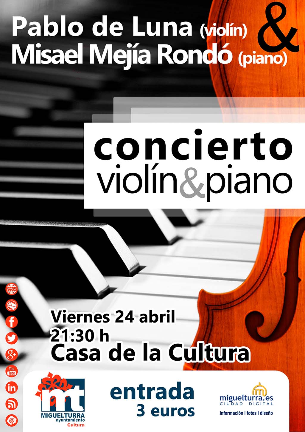 Este viernes, dentro de las actividades que organiza la Concejalía de Cultura del Ayuntamiento de Miguelturra, en la Casa de la Cultura podremos asistir al concierto de violín y piano a cargo de Pablo de Luna y Misael Mejía Rondó con entrada a 3 euros, con la colaboración del portal web.