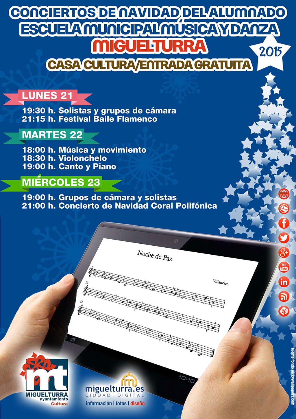 La Escuela de Música y Danza de Miguelturra, perteneciente al Área de Cultura del Ayuntamiento, da a conocer los conciertos de Navidad a cargo del alumnado de sus diferentes cursos, en colaboración con portal web www.miguelturra.es, y que se desarrollarán desde este lunes 21 de diciembre al miércoles 23 inclusive en la Casa de Cultura con entrada gratuita, siendo una de las muchas ocasiones en las que podemos comprobar el nivel del alumnado en sus diversos cursos y disciplinas musicales.