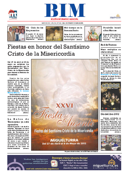 Desde estas fechas ya está disponible el Boletín Informativo Municipal del mes de mayo de 2012, más conocido como BIM, en el portal web www.miguelturra.es, página oficial del Ayuntamiento de Miguelturra, periódico que refleja las noticias más relevantes que se han publicado en los medios de comunicación locales, además de zonas de opinión general, imágenes del recuerdo, entre otros temas.