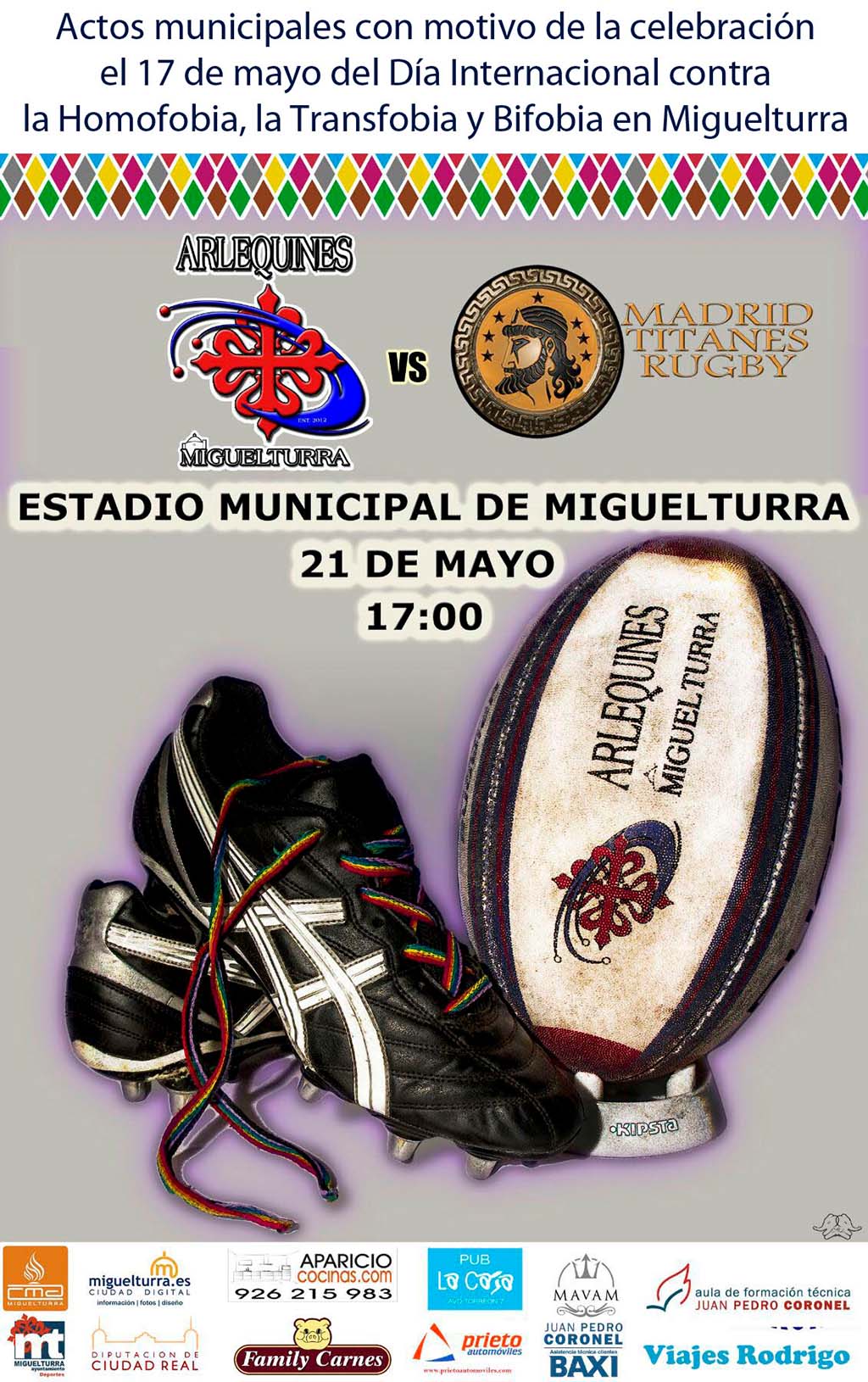 Tras la proyección del documental "El viaje de Carla" el 10 de mayo se desarrollará el segundo acto municipal programado, la cita será el día 21 mayo a las 17 horas en el Estadio Municipal el partido de rugby entre el equipo local Arlequines contra los Titanes.
