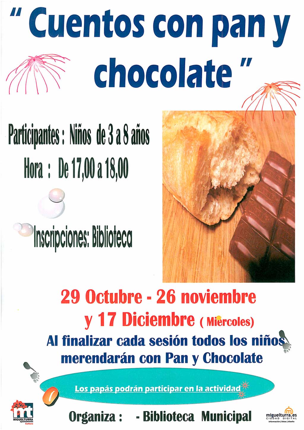Se trata de una iniciativa que pretende fomentar el hábito de la lectura entre los más pequeños. Concretamente, "Cuentos con pan y chocolate" está dirigido a niños y niñas con edades comprendidas entre 3 y 8 años y la peculiaridad que se presenta es que al término de cada una de las sesiones los participantes serán obsequiados con una merienda consistente en pan y chocolate. Hay que destacar que durante el desarrollo de las sesiones los participantes tendrán que estar acompañados de sus papás, mamás o abuelos.